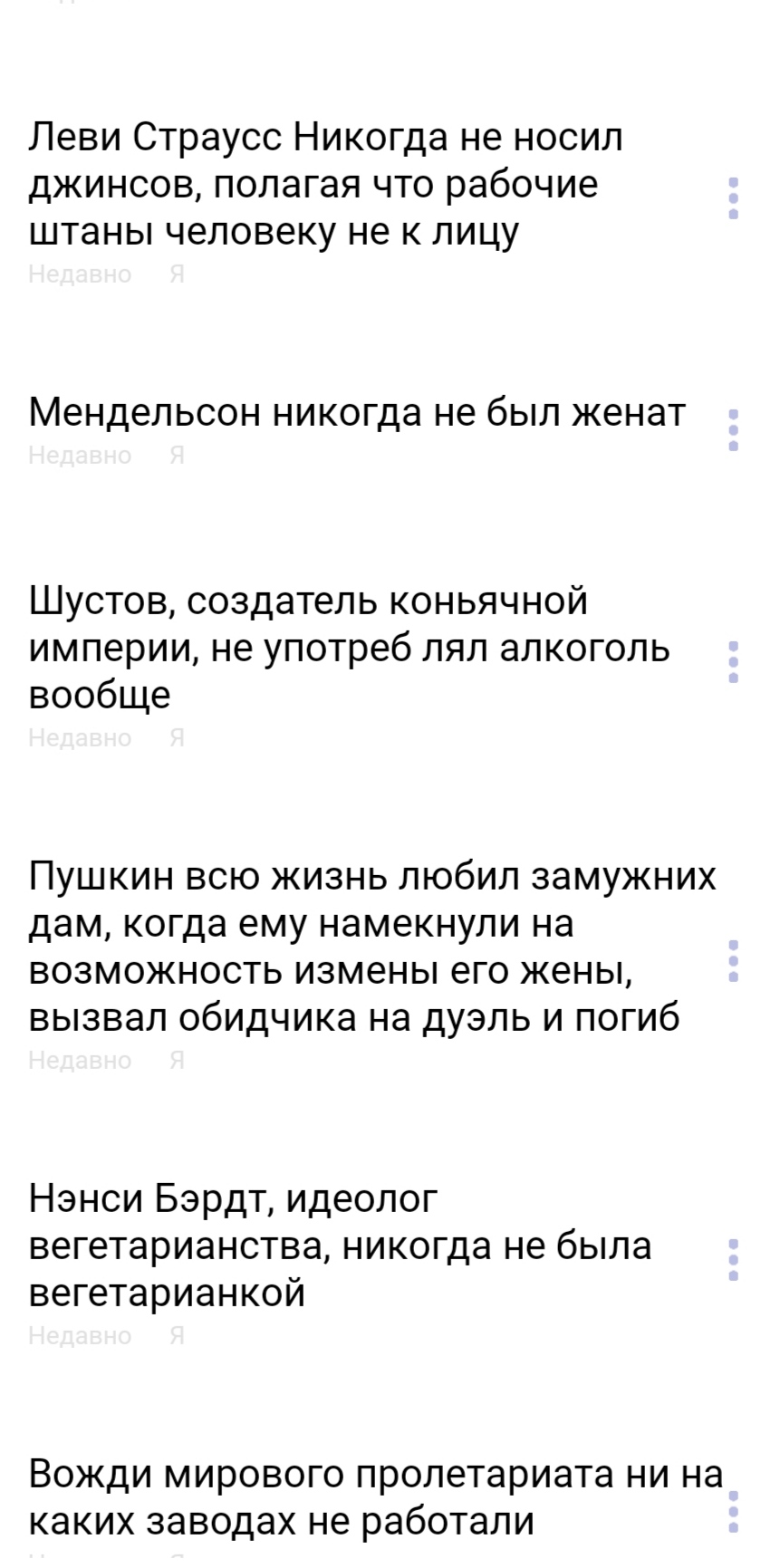 Õîòÿ áû îäíó êíèæêó ìåìóàðîâ äåéñòâóþùèõ ëèö ïðî÷èòàëè. Íåò. Èíòåðåñíåå êîíñïèðîëîãèÿ è áðåä. Ïî÷åìó ëþäè ñêëîííû âåðèòü â áðåä ? ) Íà ðàáîòå êîëëåãà, åñòü âåðèò â òàðòàðèþ, ëåòàþùèé òàðåëêè, åññíî ìèèëèàðä (êàê áåç ýòîãî) è àëüòåðíàòèâíóþ èñòîðèþ). Ïîñìåèâàþñü. îáùàÿñü íà ýòè òåìû. Èíòåðåñíûå âñå-òàêè åñòü ëþäè. |